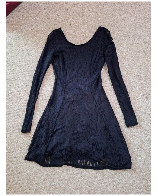Lace, fully lined dress with long sleeves. The sleeves are not lined. The dress has a round neck at the front but is "V" shaped at the back. Comfortable, stretchy material and has ribbons to help hang it up.
