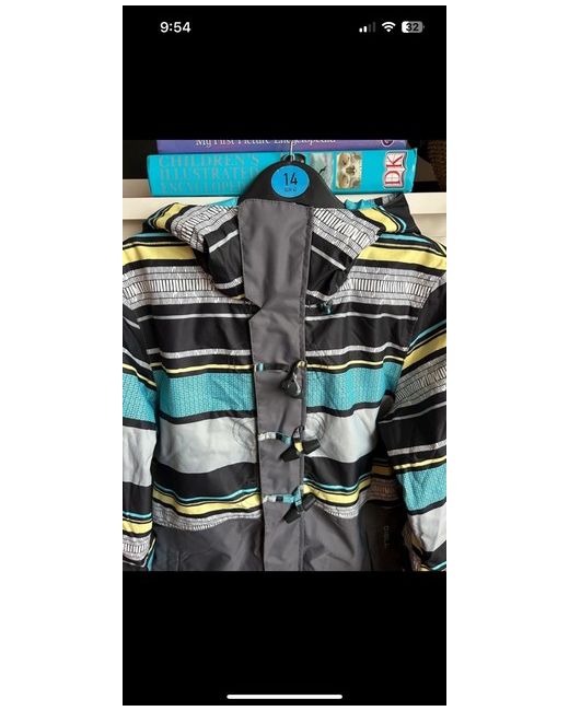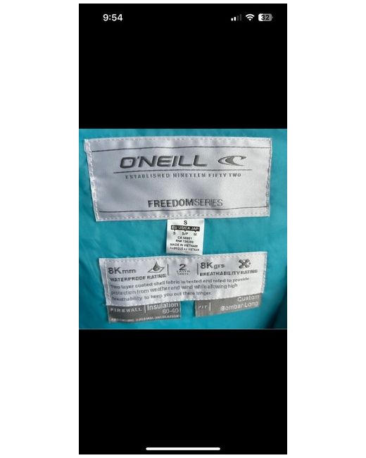 O'Neill snow / weatherproof long bomber coat size S freedom series Waterproof / breathable. Insulation 60-40 Blue striped pattern Blue hand straps, slightly worn from wear Worn once on a 5 day ski holiday, shown worn in photos- yellow trousers also for sale on page No noticeable holes or marks other than on the underneath hand covers - shown in last 2 photos Velcro, zip up Hood and zip up pockets