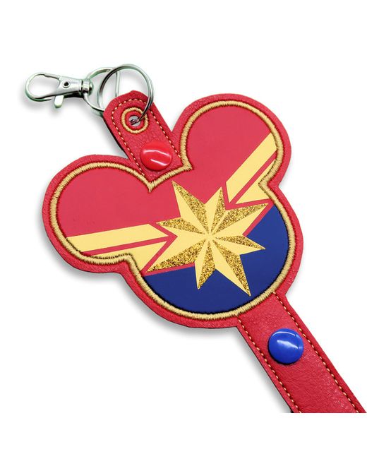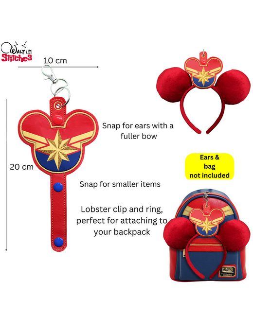 Unleash your inner hero with this Marvel-inspired embroidered vegan leather Minnie ear headband and sunglasses holder, designed in the iconic style of Captain Marvel, aka Carol Danvers. Perfect for showcasing your gorgeous Minnie Mouse ears collection instead of stuffing them in your loungefly bag out of sight, this holder embodies strength and style, making it a must-have for any Marvel fan.
