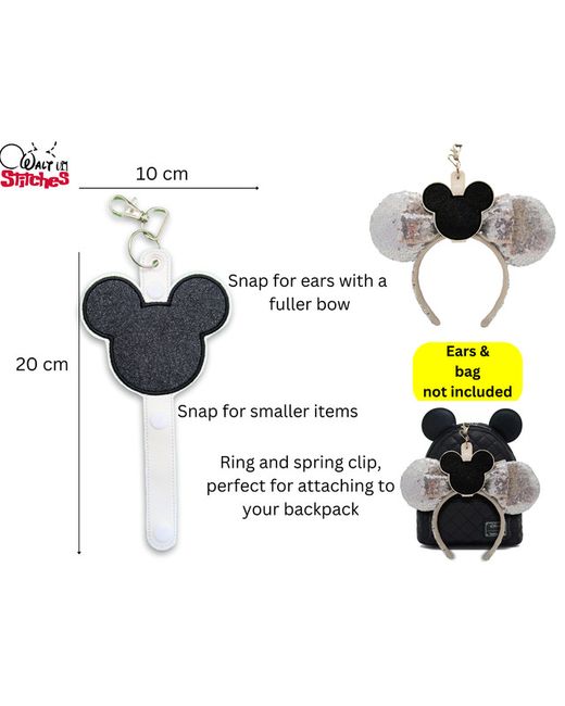 Mickey Mouse Head Inspired Ears Headband & Sunglasses Holder. Depending on the size and shape of your ears (not included), you can choose to snap at the just below the spring clip for your ears headband or just below the head for your sunglasses.