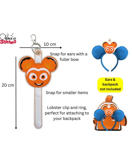 Finding Nemo Mickey Clown Fish Head Inspired Ears Headband & Sunglasses Holder - White/Nemo. Finding Nemo inspired embroidered faux leather, vinyl ear/sunglasses holder. Depending on the size and shape of your ears (not included), you can choose to snap at the just below the spring clip for your ears headband or just below the head for your sunglasses.