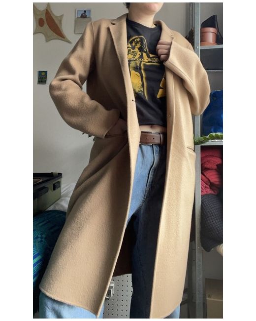 Camel-coloured cashmere/wool overcoat. One button, two pockets. Soft as soft can be! Super lightweight but warming. Some defects as shown in the pictures. Bought for $795 on holiday in Texas