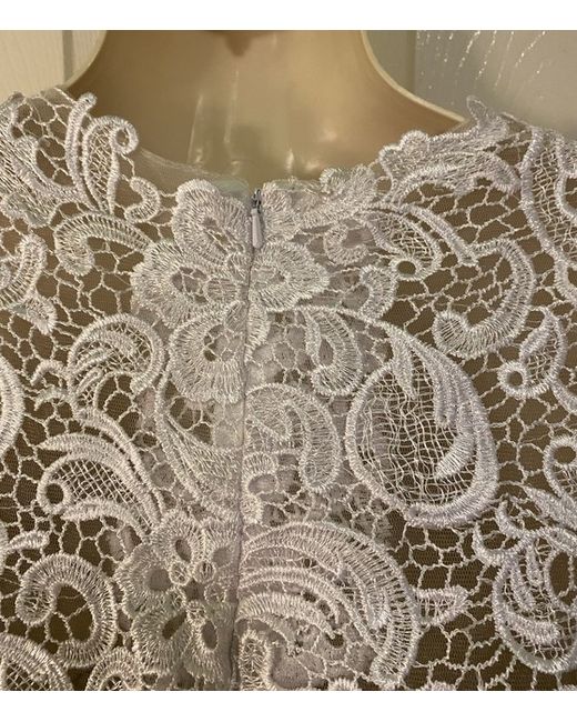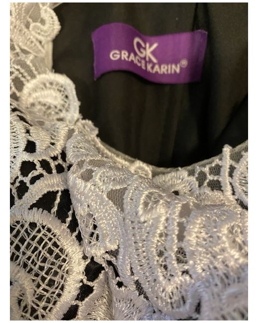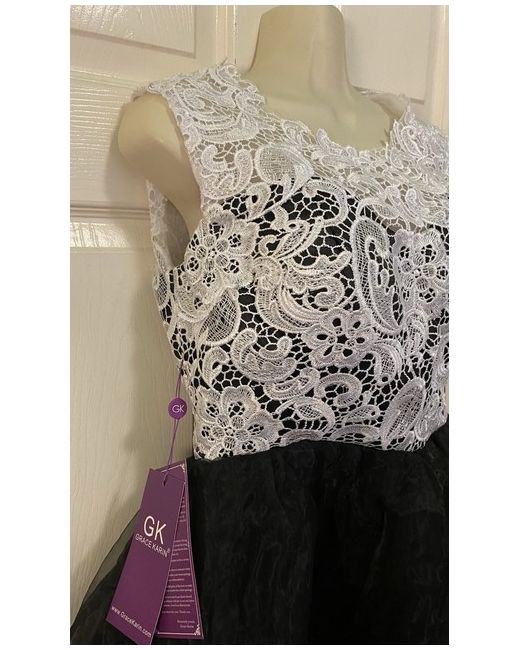 The Grace Karin dress in size 12 features a beautiful lace floral pattern on a white top and black skirt, creating a stunning fit and flare style. With a sleeveless design and knee-length hem, this dress is perfect for weddings, parties, or 50s-themed events. The addition of layered accents and a zip closure gives this dress a unique and elegant touch, while the lined interior ensures comfort and quality. Perfect for any woman looking to make a statement at a special occasion. Zip needed encouragement over back waist where there are layers of material. Persevere and it moves easily.