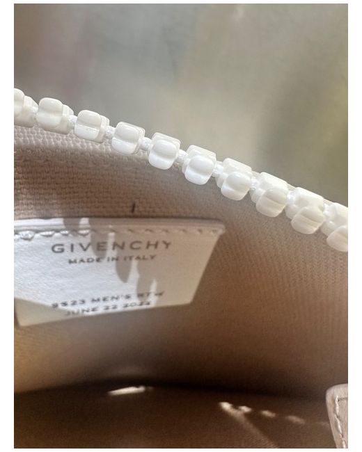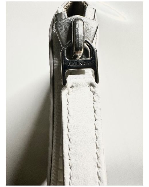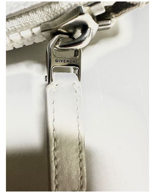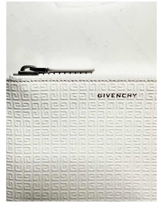 GIVENCHY POUCH WHITE WITH DEBOSSED MONOGRAM THROUGHOUT. Silver painted logo on front. Logo on zipper.