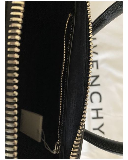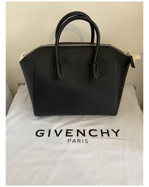 Medium Antigona bag in black grained leather. Trapezoid-shaped handbag with triangular GIVENCHY patch, oversized zipper, and metal details. Adjustable and removable shoulder strap included in original protective packaging (see picture). Two flat pockets and one zippered pocket inside. Never used and reluctantly selling due to new family. Tags are all still on and comes with the original dustbag. Further photos available on request. MRP £1,690.