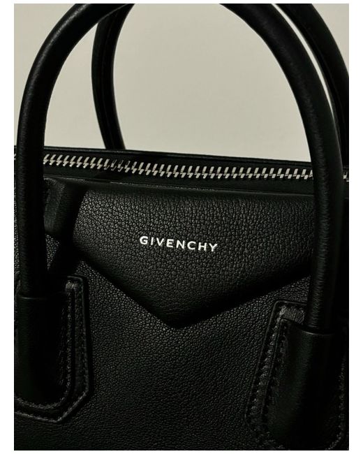 Givenchy Antigona Bag. Colour and material: Black Goatskin Grained Leather. Givenchy lettering on front of bag is pressed/ stamped on with silver coloured foil. Serial number is visible on reverse side of leather tab, which is sewn onto inside zip pocket.