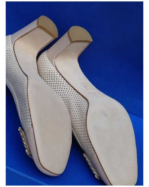 Stuart Weitzman. The widest part of the sole is 8.4 cm. The innersole is 27.5 cm. The heel is 6.5 cm. It also looks amazing on a tanned skin.