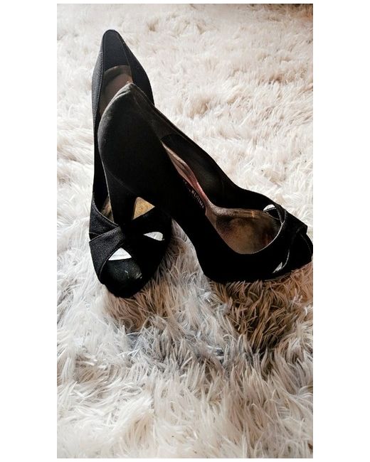 This is a new Stuart Weitzman heel for women in size 7.5. It features a peep toe with a Cuban heel style and a cross-over design, made from a black cotton blend fabric. Beautiful heels just too big for me and so Comfortable.