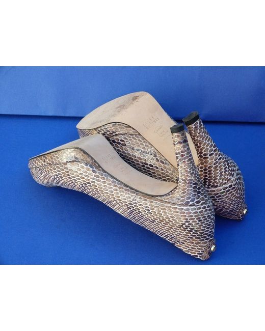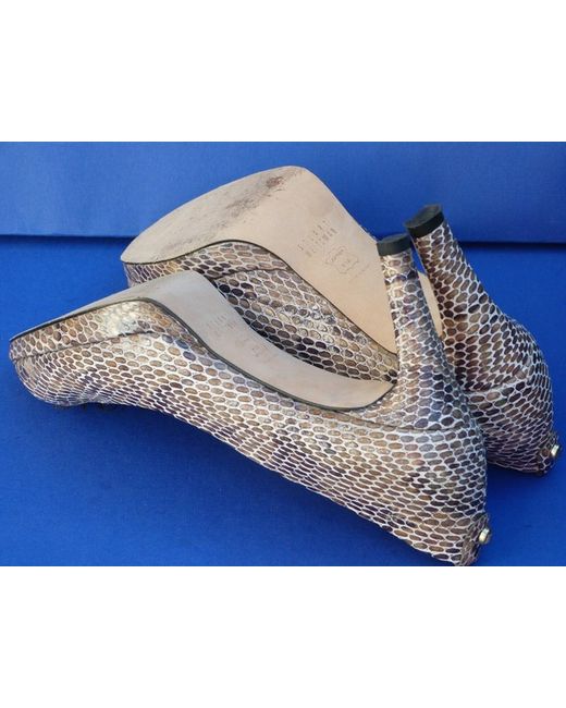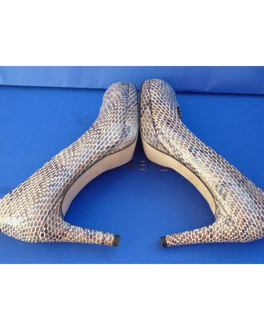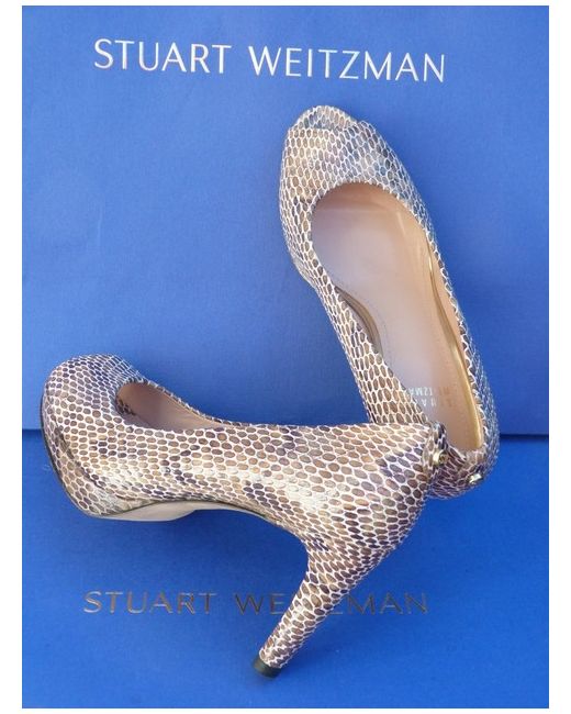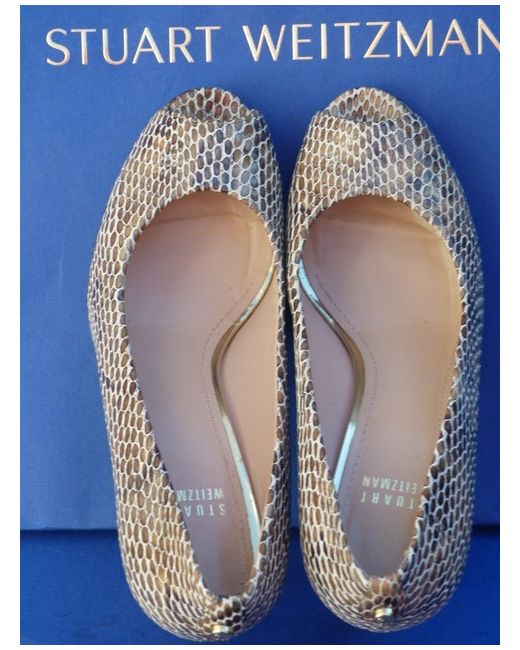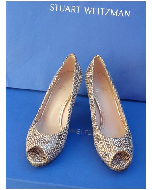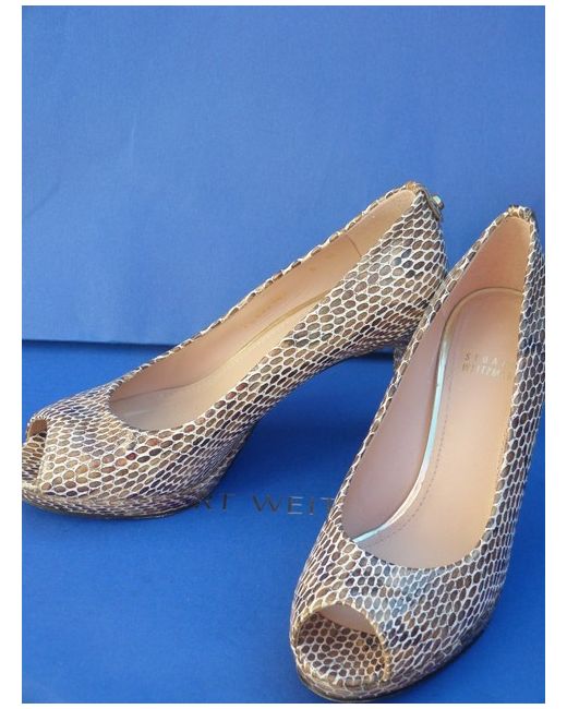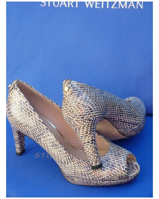 Stuart Weitzman. Reasonable height heels. Stunning 100% print snake/stone/grey/ivory colour leather. The patent leather is always stiffer and takes a bit longer to stretch them. The widest part of the sole is 7.5 cm.