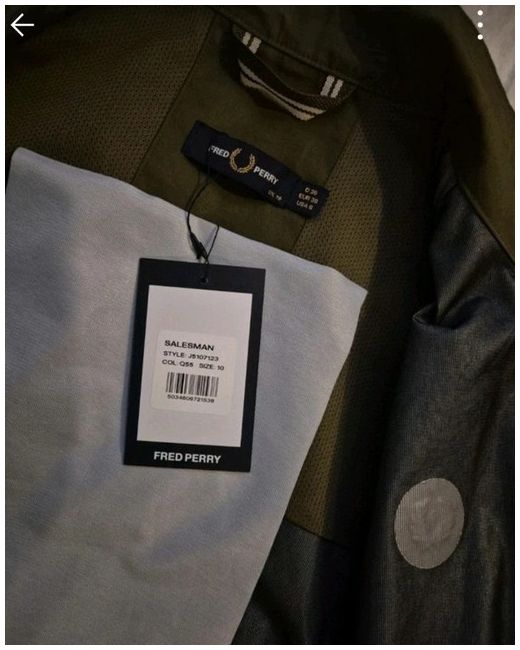 Fred Perry oversized khaki cropped Bomber jacket. Brand new. Never worn as felt to big. Size 10 but would easy fit 12 as oversized. Very stylish.