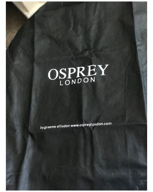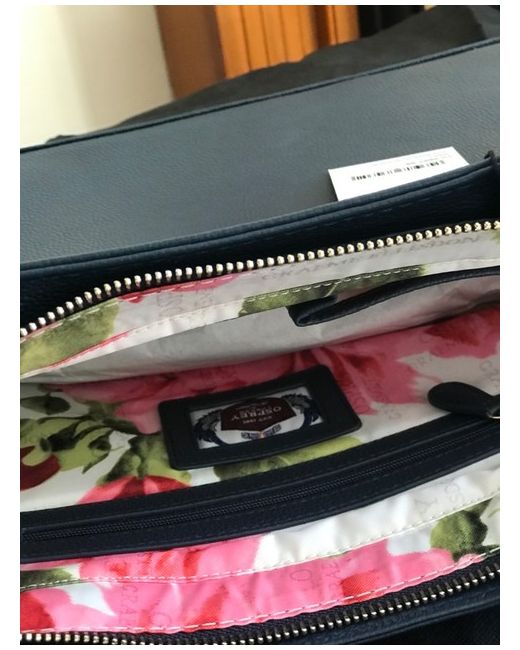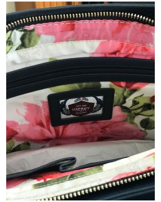 It has a dust bag, interior lining with osprey design and roses very pretty. navy in colour never used.