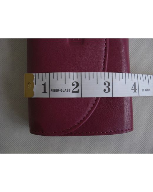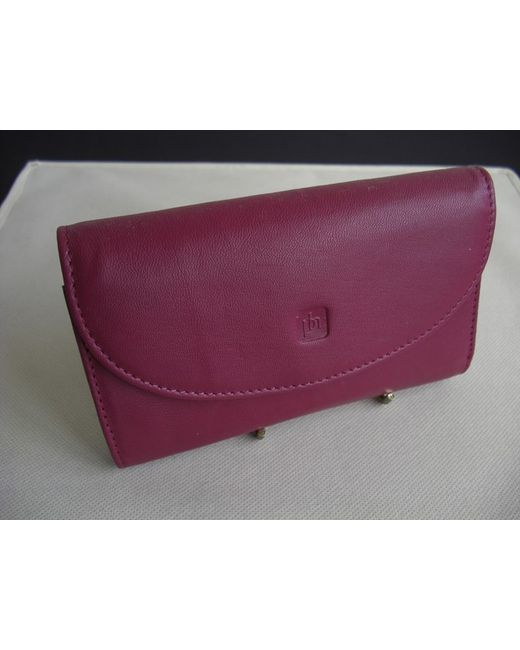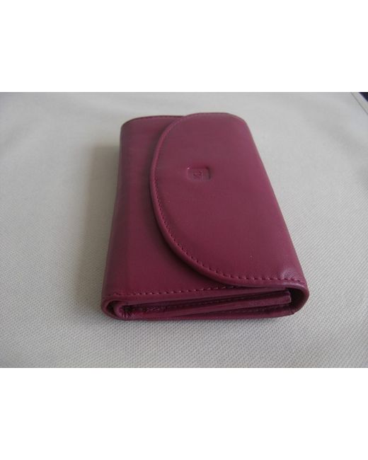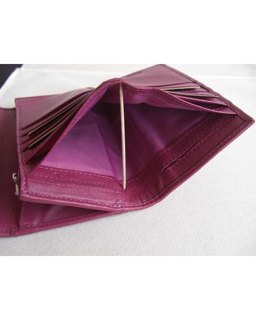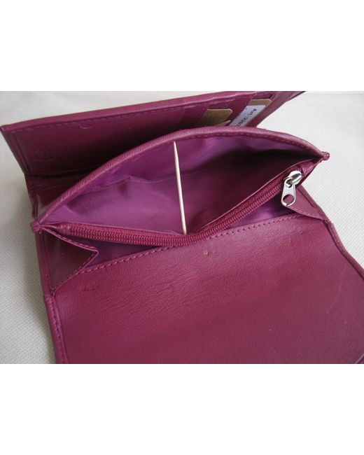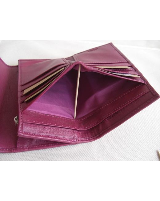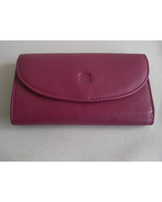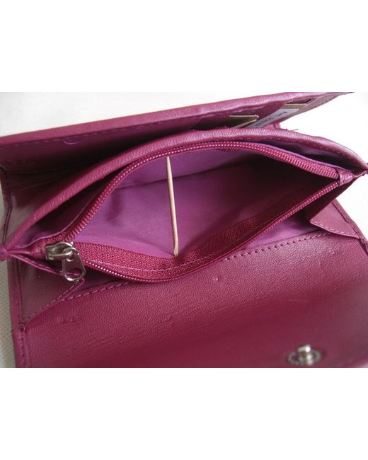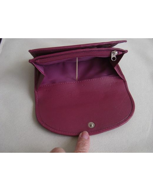 Dark pink leather bifold flap over wallet purse. External slip pocket at back. Lined in pink fabric.