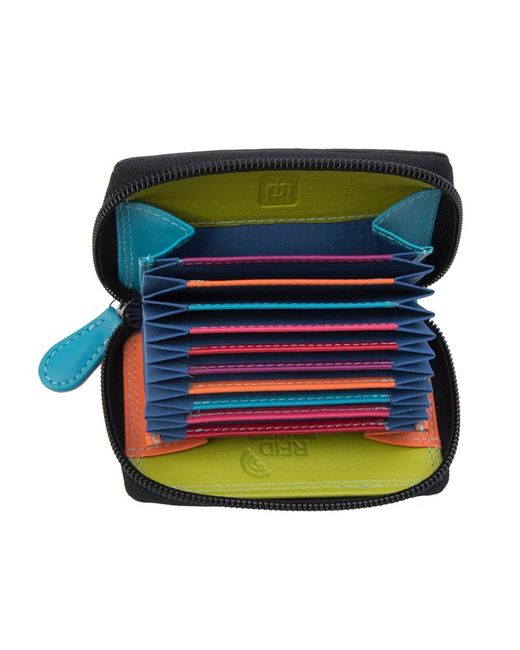 RFID SAFE Zip Around Card Holder London Collection RFID Multi Colour zip around Credit Card Holder, with a soft black leather outer which looks relatively understated from the exterior, but opens up to reveal a spectrum of red, blue and purple shades.