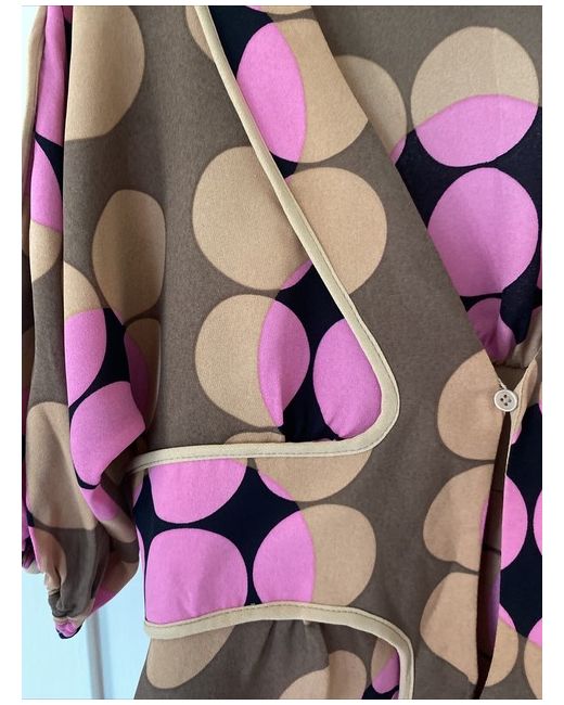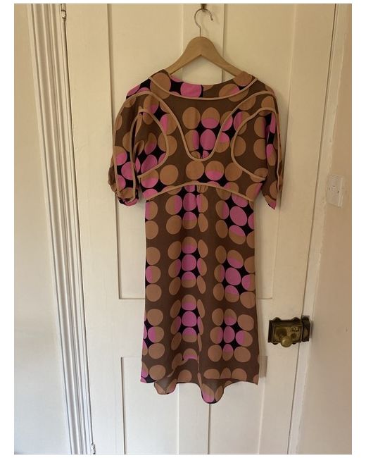 The most beautiful Marni dress that I bought in Florence about 20 years ago. Never worn. Zip fastening at side with a button in the middle at bust. Dress has a cut out underneath this. Really unusual style. Silk. Elasticated short sleeves. Dress is cut slightly longer at the front than the back. UK12 Really beautiful dress, so sad to see it go- it was such a find. Very minor silk pull on the back from storage.