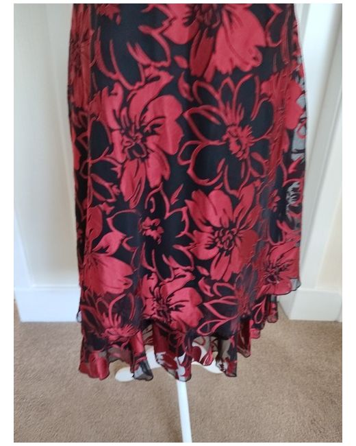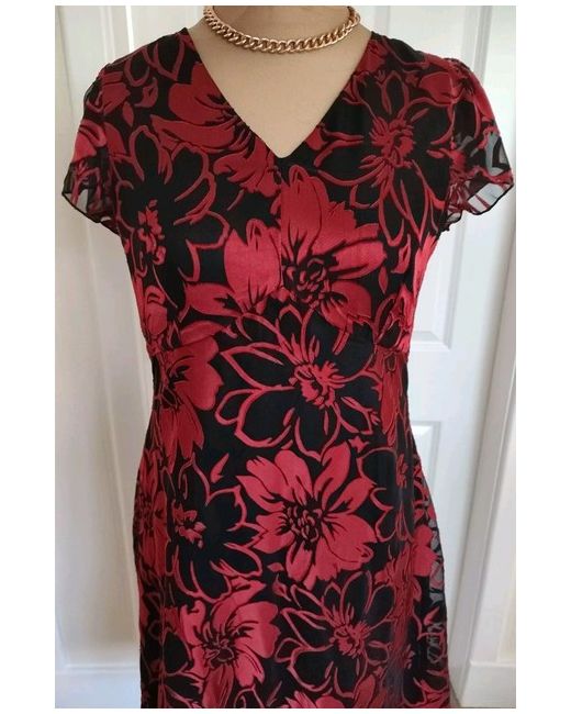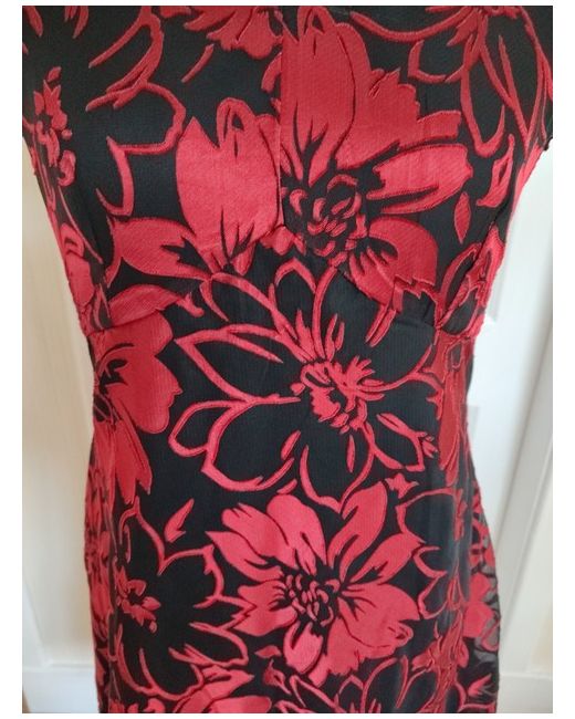 The dress features a beautiful floral pattern in black and red, with a flattering V-neckline and short sleeves. The zip closure ensures a secure and comfortable fit, while the lined floaty material adds a touch of elegance to the dress.