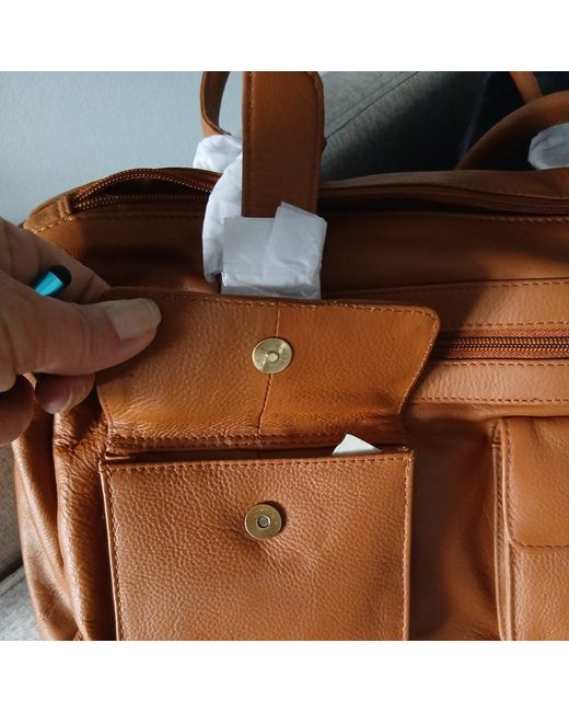 large tan leather ladies handbag, ideal for work, features a large zip pocket back and front, and 2 patch pockets on the front, 2 inside pockets one of which is zipped, very spacious inside made of soft tan leather.
