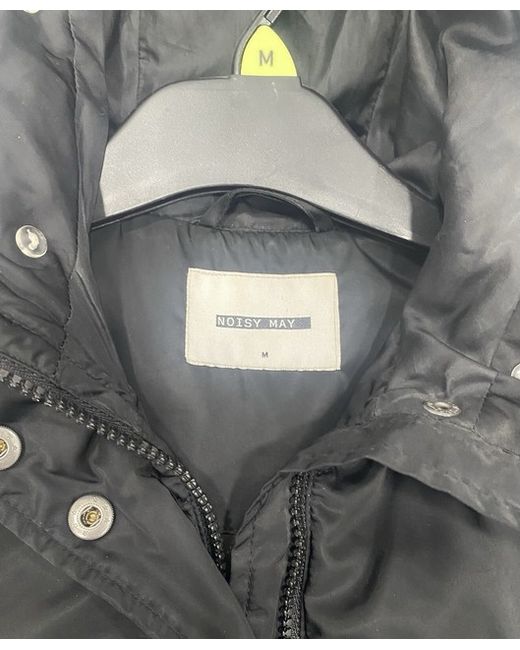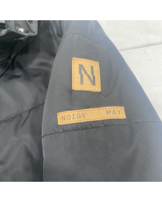 This Noisy May women's jacket in size M is a classic black polyester jacket with long sleeves and a zip closure. It is suitable for travel or casual wear and has a regular fit. The jacket does not have a vintage style and is branded as Noisy may. It has a basic jacket style and is a versatile addition to any wardrobe.