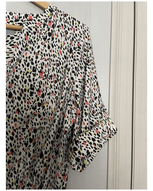 PURE Collection silk dress. Ivory background with black, coral and brown print. Drawstring belt to adjust waist fit. Covered buttons down front to hem.