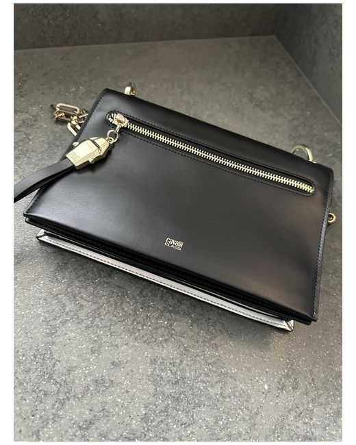 Cavalli Stunning black cross body or grab bag with silver and green side accents Gold tone adjustable geometric strap Front zippered pocket Oversized signature RC tiger head zip pull Material: leather Strap drop height: 52 cm Color: black with silver and green sides Type of closure: flap lock Compartments: 2 Size: H-17 x L-24 x D- 6 cm