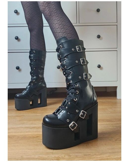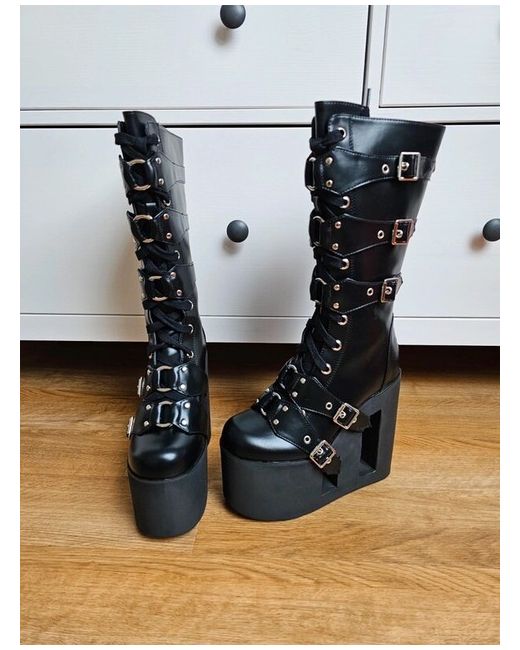 These Killstar Descending Platform Boots in UK size 6 are designed for women who appreciate a bold, alternative style. The boots feature a wedge heel and platform sole, providing both height and comfort. The black faux leather material adds to the edgy look, while the star theme adds a touch of celestial charm. Ideal for those who want to make a statement with their footwear, these boots are a versatile and stylish addition to any wardrobe.