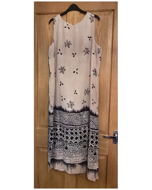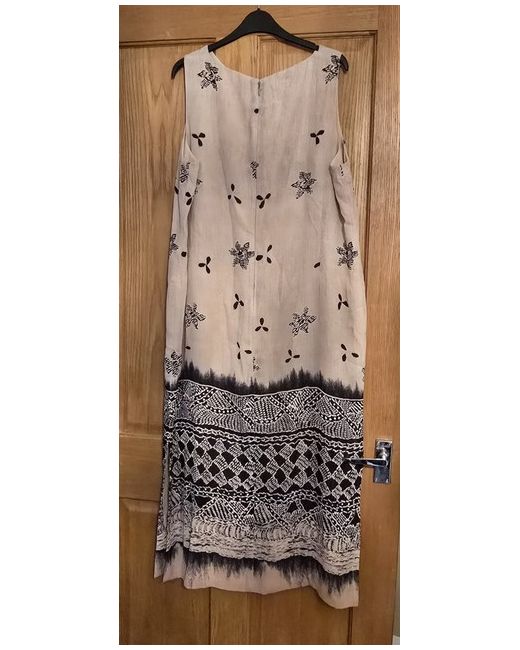 This is a new, sleeveless Platinum maxi dress in beige, made of acrylic material. It is designed for plus-sized women, featuring a long dress length suitable for special occasions like weddings or parties. The dress is size L and exudes an elegant style perfect for formal events.