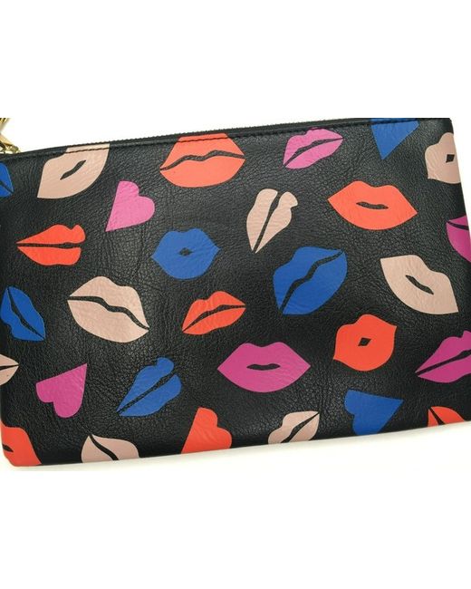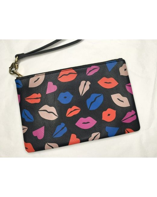 The purse is a zip purse inside the purse is a slot for credit/ bank cards. The purse is BLACK WITH MULTICOLOURED LIP PATTERN. The purse is leather.
