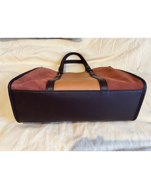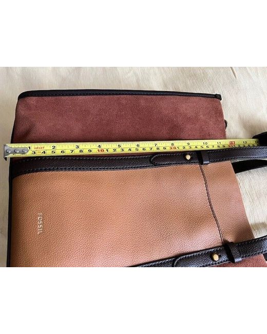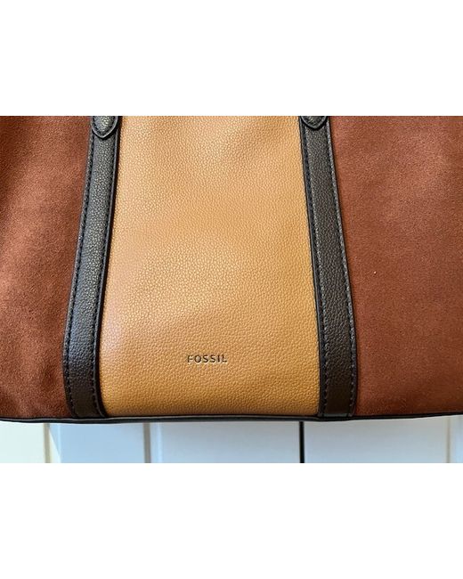 This is a gorgeous Fossil leather tote bag with suede panels. Three tones of coffee & chocolate browns with a black fabric interior. Shoulder strap and handles for maximum versatility. Two internal zipped pockets and a magnetic stud closing for main opening.