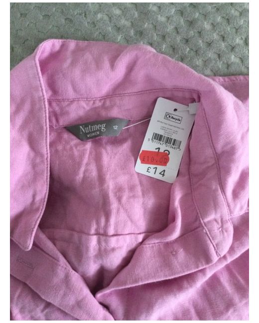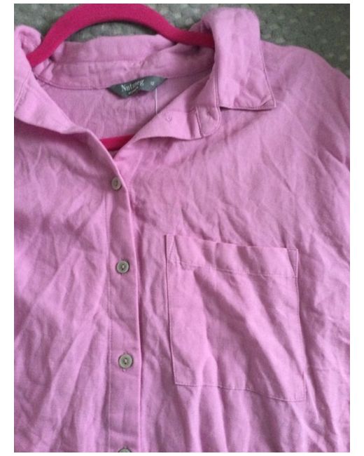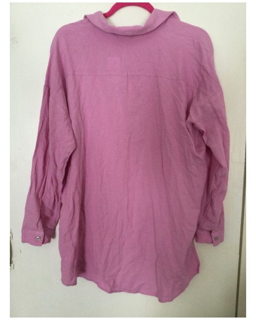 Long sleeves and has a collar. Buttons down the front. Pocket on front.51% viscose, 37% cotton, 12% linen.