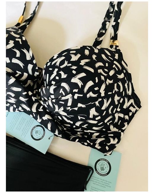 The black-and-white top features a flattering underwired padded design with gold accents for a touch of luxury. Paired with classic black bottoms, this bikini is perfect for lounging at the beach or pool in style and comfort.".