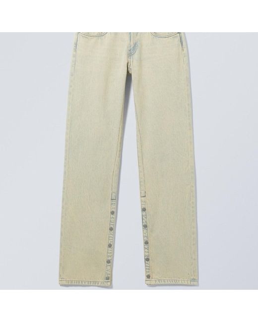 A pair of low-rise straight leg Y2K jeans made from an organic cotton and recycled cotton rigid denim. This popular style has snap button side slits, classic five pocket detailing, a regular fit, and looks great with most footwear.