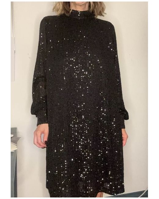 Black sequin shift dress with turtle neck (button closure) and tie for versatility in styling. I’m 5ft4 and it sits just above my knee. It’s labelled a 6 but would think an 8 would also fit in the dress. Selling as didn’t return on time (only 2 weeks instead of 4).