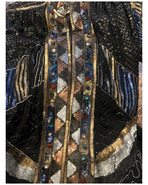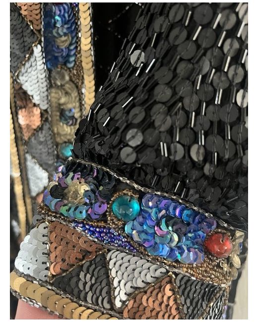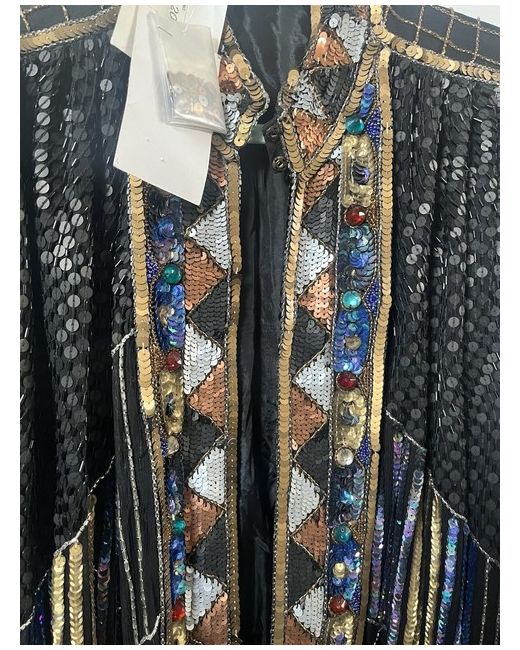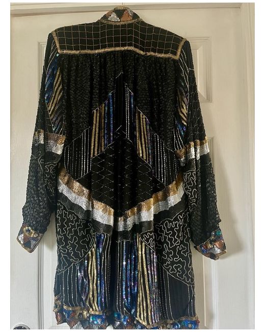 This is a stylish Frank Usher Trophy Jacket from the 90s, made of 100% silk in multicoloured tones. It features long sleeves and a knee-length design, suitable for women in size small. The jacket is brand new with tags, showcasing the originality and quality of the Frank Usher brand.
