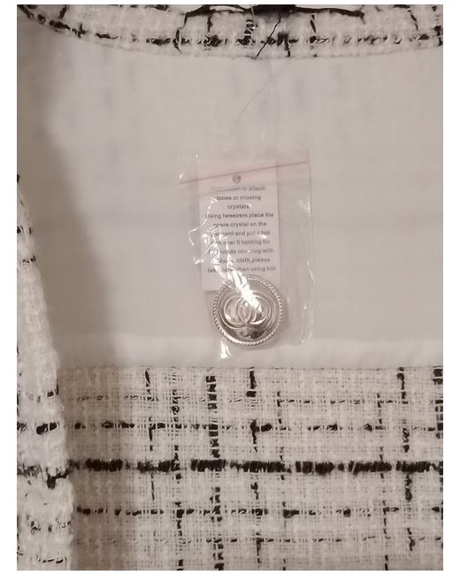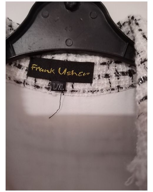 White and black with flecks of silver thread, size l/XL, never worn. Frayed edge. Pockets.