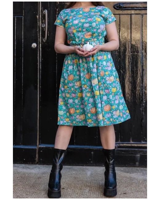 Embrace the Halloween spirit with this beautiful Run & Fly Pumpkin Patch tea dress. The dress features a delightful pumpkin patch design that will add a spooky touch to your wardrobe. It comes in a regular size 12 and has a skater style with a knee-length hemline. The dress is made of stretchy material, making it comfortable to wear all day long. It also comes with a belt that cinches at the waist to enhance your figure. The dress has pockets, making it practical and functional. Perfect for a Halloween party or a casual day out, this dress will make you stand out from the crowd.