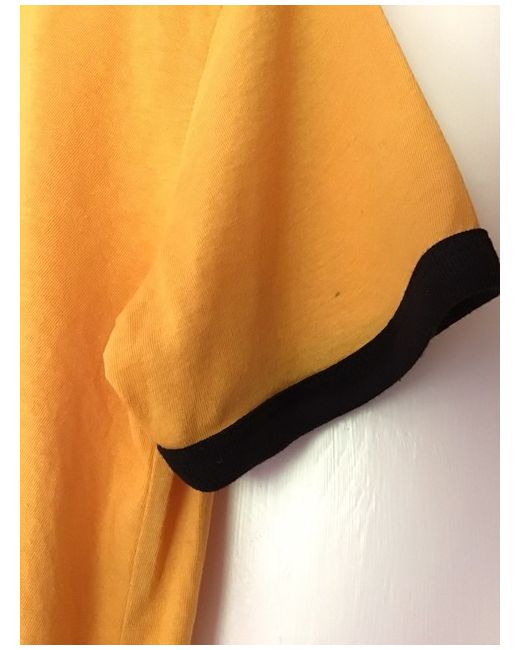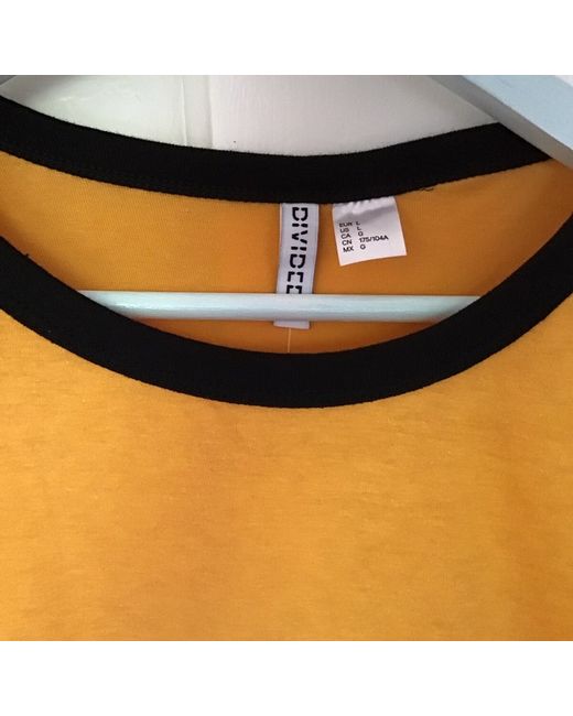 H&M Basic Divided Yellow Orange T Shirt Black Trim Size Short Sleeved - Large. Lovely bright T Shirt- it is a deep yellow/orange colour with black neck and sleeve trim. It is new with tags but please note it does have a small mark on one of the sleeves- see photo. Approx measurements Bust underarm to underarm 53 cms Length at back 55 cms Any questions please ask