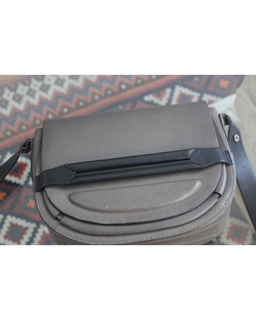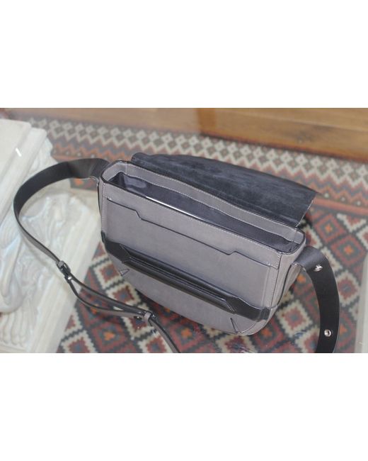 Color: Gray with black strap and accents. Features: Curved flap design, adjustable shoulder strap.