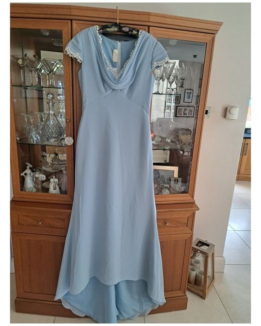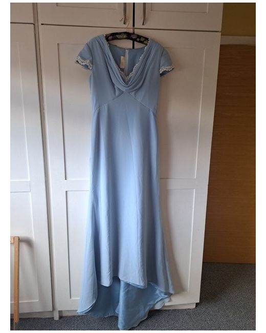 This Hilary Morgan dress is a 'lookalike' of Pippa Middleton's bridesmaid dress that she wore at Princess Catherine's wedding. The dress has a stunning V necked bodice with capped sleeves, each lined with gorgeous lace detailing. It has a sheath silhouette with a floor length train.