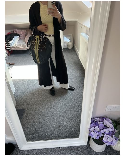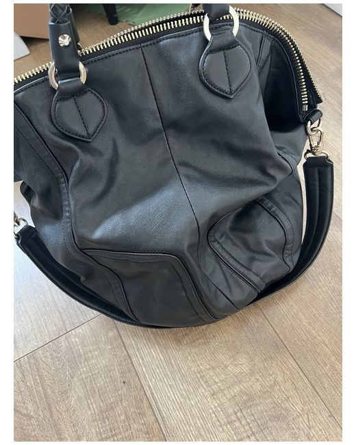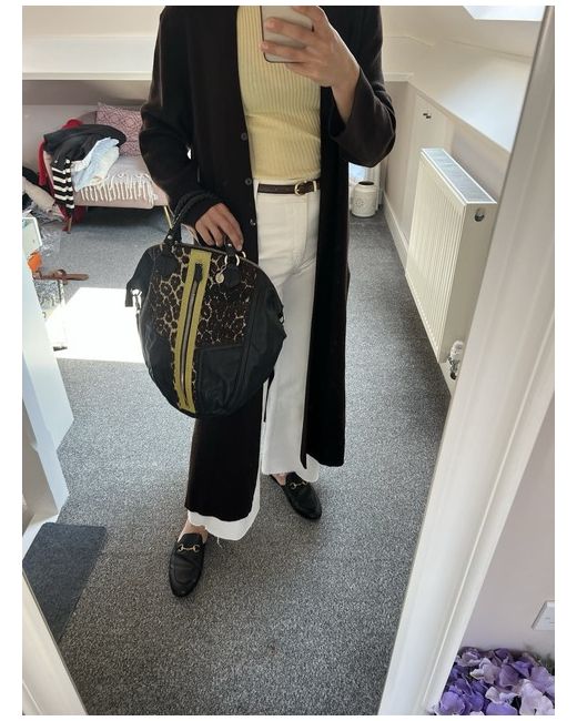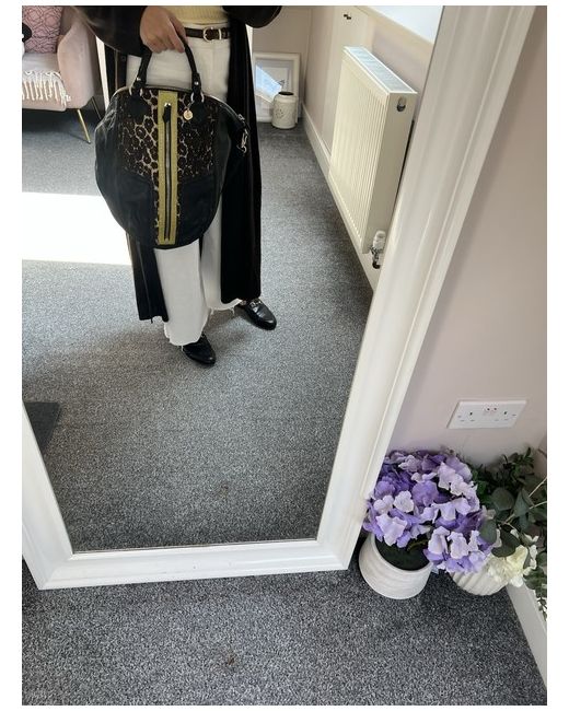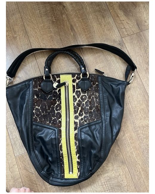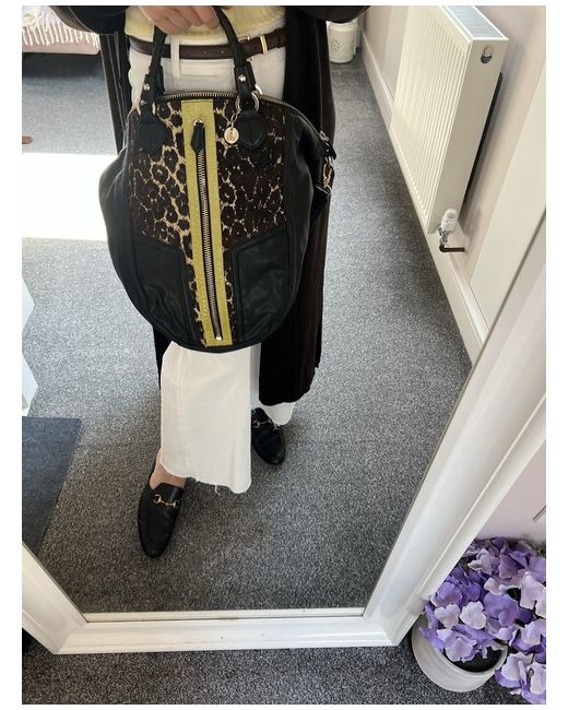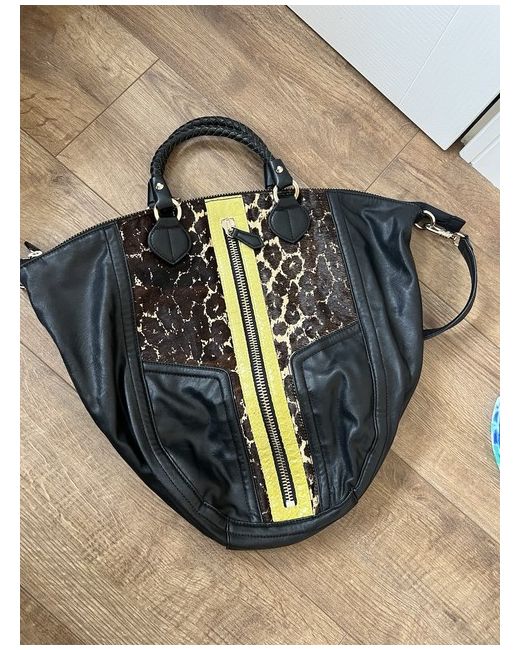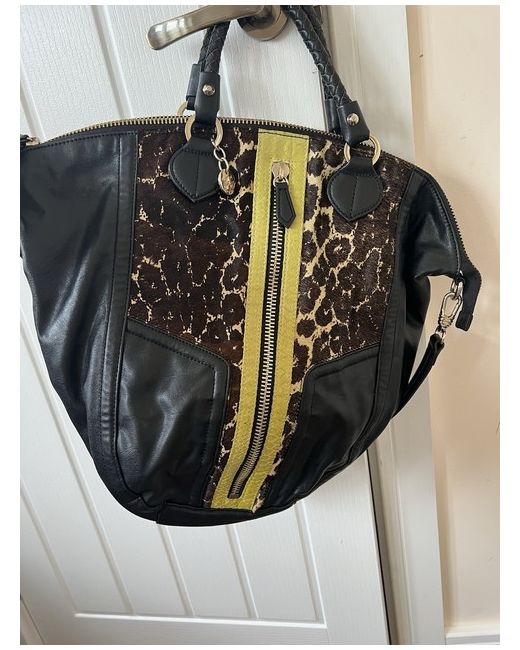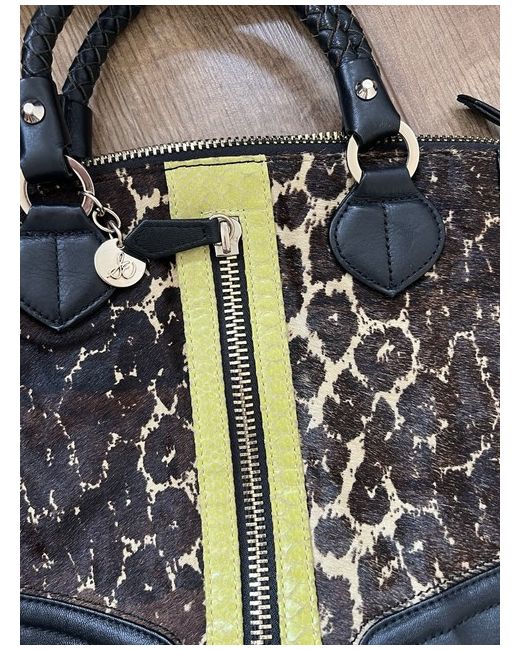 Black leather bag with calf hair brown and tan pattern in front and leather snakeskin chartreuse panel. Large front zip pocket(full size of bag). Braided handles. Interior zip pocket on one size, 2 slip pockets on the other. Bag has full zip around to open wide. Very spacious! Great condition!no issues at all! Great condition!!