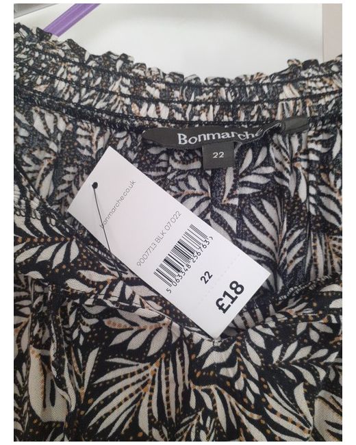 Ladies lightweight polyester and cotton leaf print top Size 22 black and bige Bon Marche Tie at front. Strech at back collar.. Great for day or evening .very smart. Brand new with tag and spare button Pit to pit 27 cms Pet and smoke free home I do combine postage please ask.