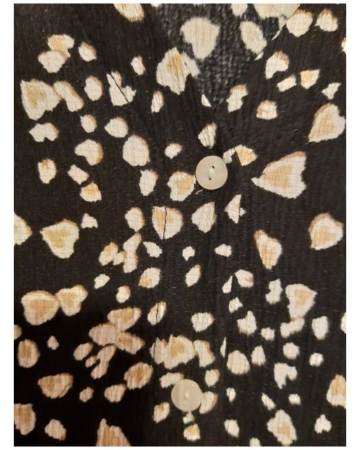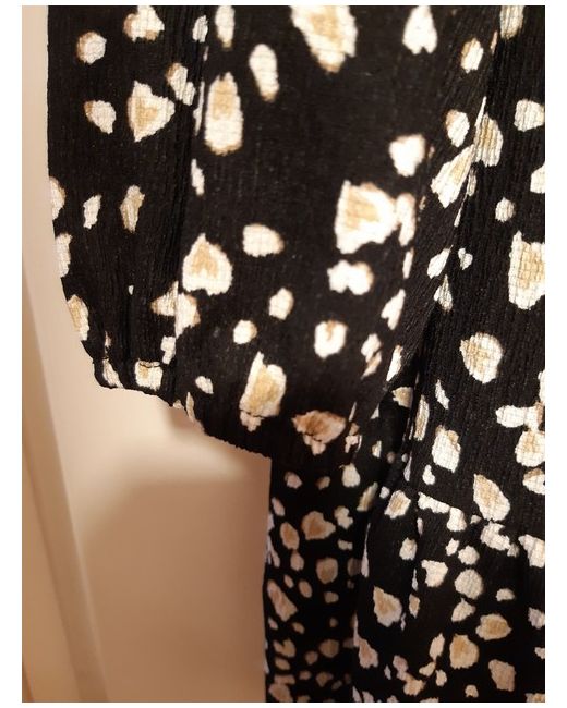 Cream/beige print on black background. 97% polyester 3% elastane crinkle fabric. Elasticated cuff, long sleeves, v neck, button through front, gathered yoke at front, deep flounce at hem. Centre back to hem 33 inches. Size 20 : bust 45 inches, waist 39 inches., hip 48 inches. Washable at 40 degrees. No tags but unworn
