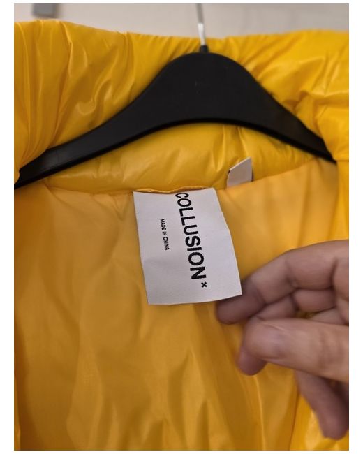 This COLLUSION puffer coat in size XS is a stylish and cosy outerwear piece for women. The mid-length coat is made from polyester with a vibrant yellow colour, perfect for adding a pop of colour to your winter wardrobe. It features a full zip closure, polyester lining, and has feather insulation for warmth. The regular fit and bodywarmer style make it ideal for casual occasions during the winter season.