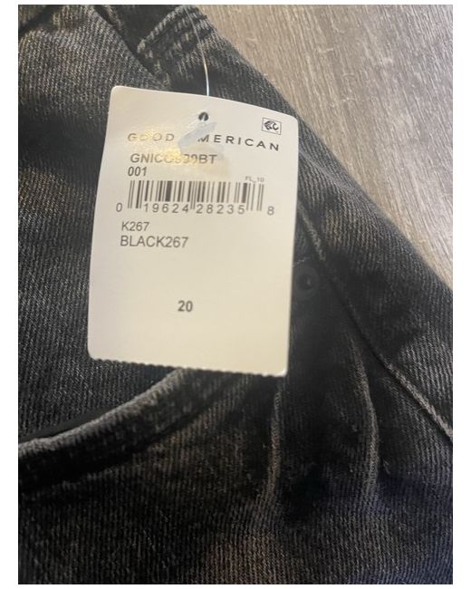 These Good American jeans in size 24 for women feature a classic black colour with a straight fit and a regular waist size. Made from cotton, they have a zip and button closure and a stylish ripped leg detail. Perfect for everyday wear, these jeans offer both comfort and a trendy look for the modern woman.
