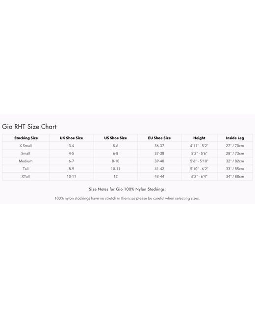 Genuine RHT Nylons featuring Small 4-5 37-38 5'2"-5'6" 28"/73cm. X Small 3-4 36-37 4'11"-5'2" 27"/70cm. Inside Leg. Shoe Size (Eu). Shoe Size (UK).