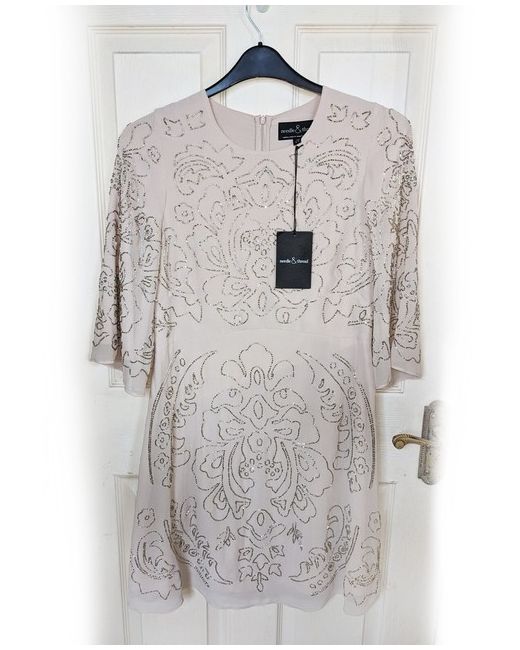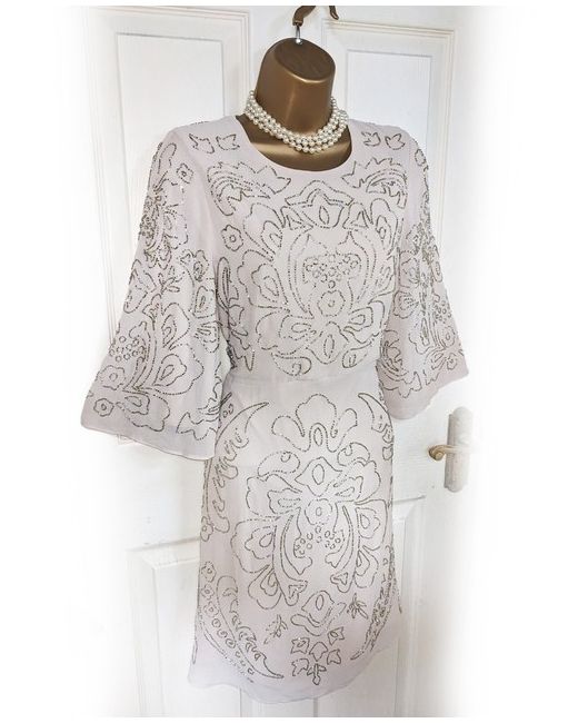 The elegant 3/4 length flared sleeves continue the stunning pattern down. The fabric is made from chiffon polyester which is dry clean only and doesn't have any stretch.