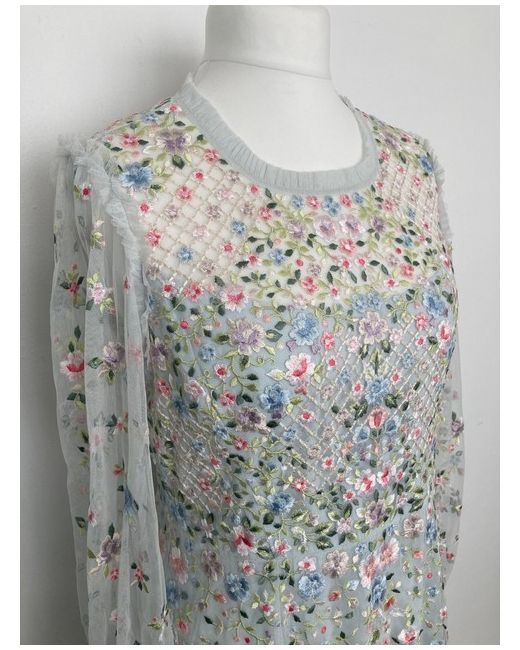 A stunning embroidered blue gown by Needle & Thread. Full length gown version. In a very soft pale blue with brighter embroideries. Very feminine with a modest cut. Fabric has a bit of give. UK size 16 (US size 12, EU 44).