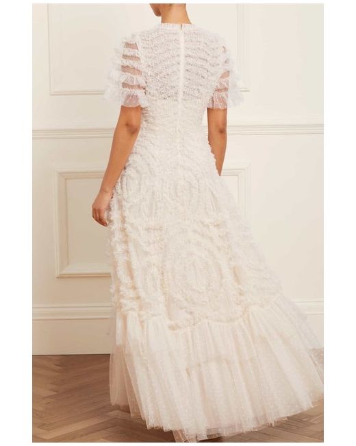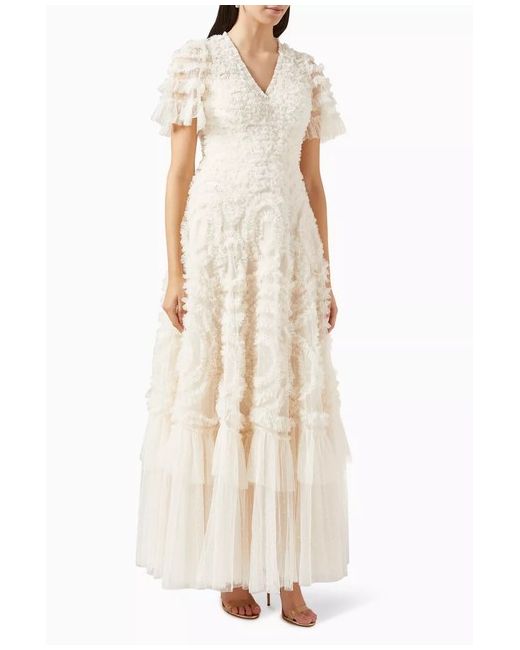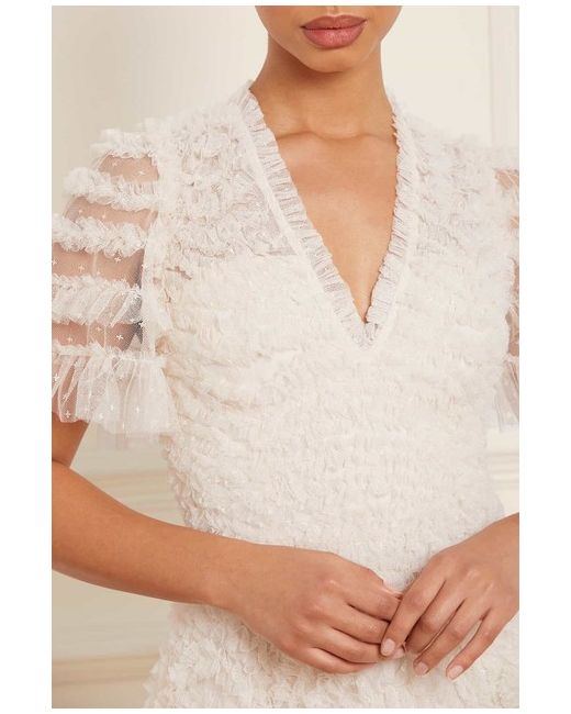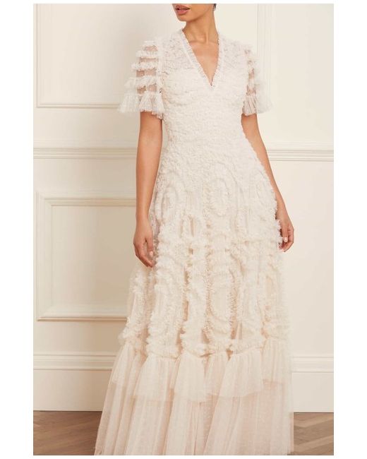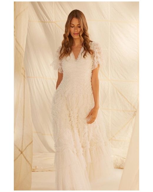 The Verity Ruffle V-Neck Gown in Champagne/Cream. A brand new style for the season ahead. This textile piece is designed with signature Needle & Thread detailing. Beautifully developed with romantic, frothy tulle and delicate ruffles, creating a beautiful artistic effect and flattering shape. Make a statement in the Verity. RRP £465