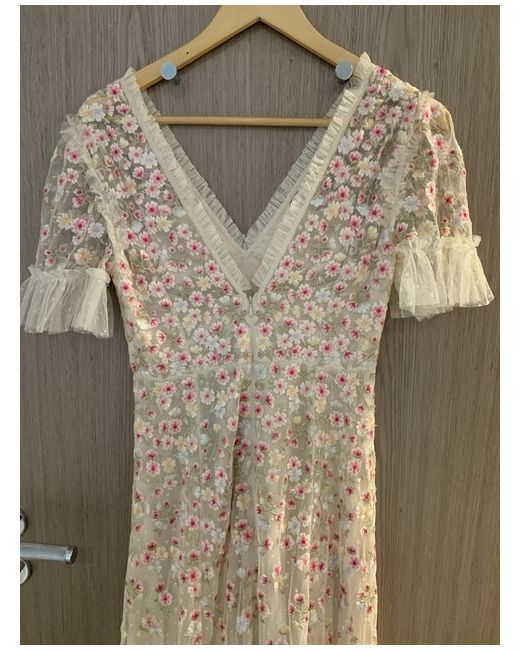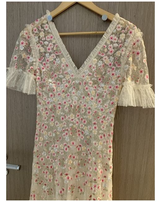 The evening dress gown in cream/Azalea pink , it a delicately scattered wet itv all over floral embroidery. Beautiful developed with bright pink , blue and yellow tones for an enchanting colour palette. The silhouette of the dress featuring an effortless shape skirt with a layered,tiered hem for extra movement . This is a versatile piece of any occasion. It has a concealed zip centre back. 100% polyester