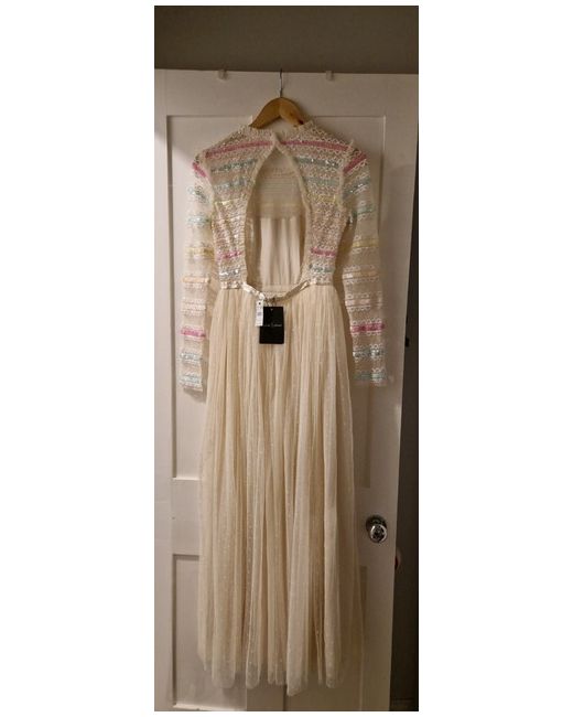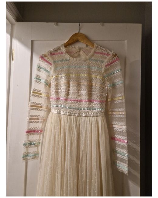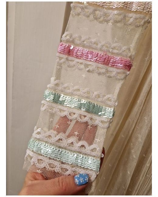With its intricate rainbow pattern and sparkling sequin accents, this ivory fit & flare dress is a celebration of femininity and colour.