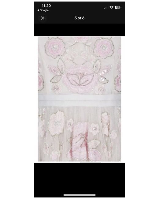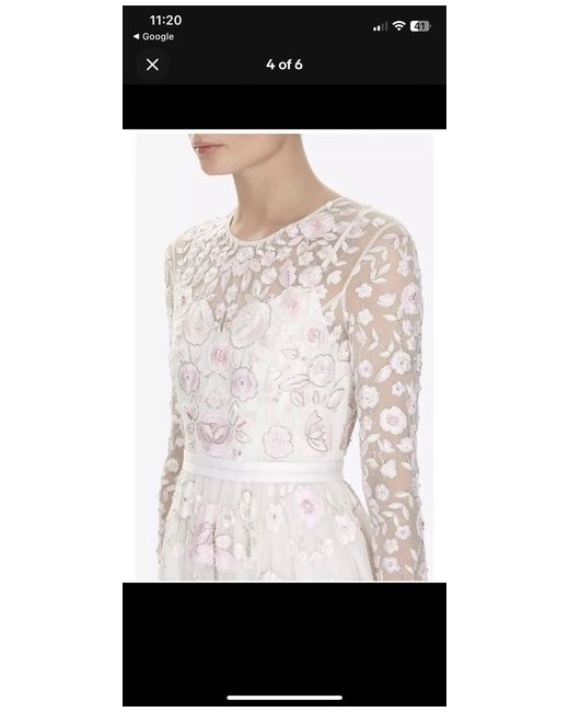 Veil is also included in the price (see images). RRP £300 for veil alone. UK SIZE 8 - US SIZE 4 The dress is absolutely beautiful and the amount of detail in the embroidery shows how much effort has gone into making it. Hence, why it's sold out! Inspired by bridal bouquets of pretty pink roses. The Rosette Gown blooms with blush-hued petal embroidery, cascading from bodice to hem, with elegant semi-sheer sleeves. Voluminous with frothy white tulle, this floral wedding dress is perfect for the modern fairytale Bride. We love the grosgrain ribbon waistband - a signature Needle & Thread detail. Product Details: Outer 100% Nylon tulle, lining 100% polyester crepe de chine. Concealed zip at centre back. Internal camisole to the waist with a fully lined skirt.