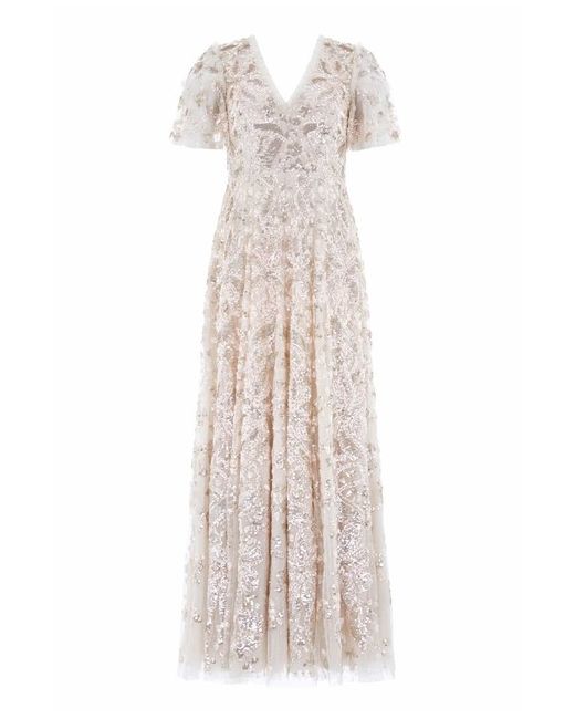 The Trailing Bow Gown in Cream. This gown is engineered with an intricate artwork featuring ribbon bows cascading down the gown. Featuring scattered floral and scallop motifs for romantic detailing.